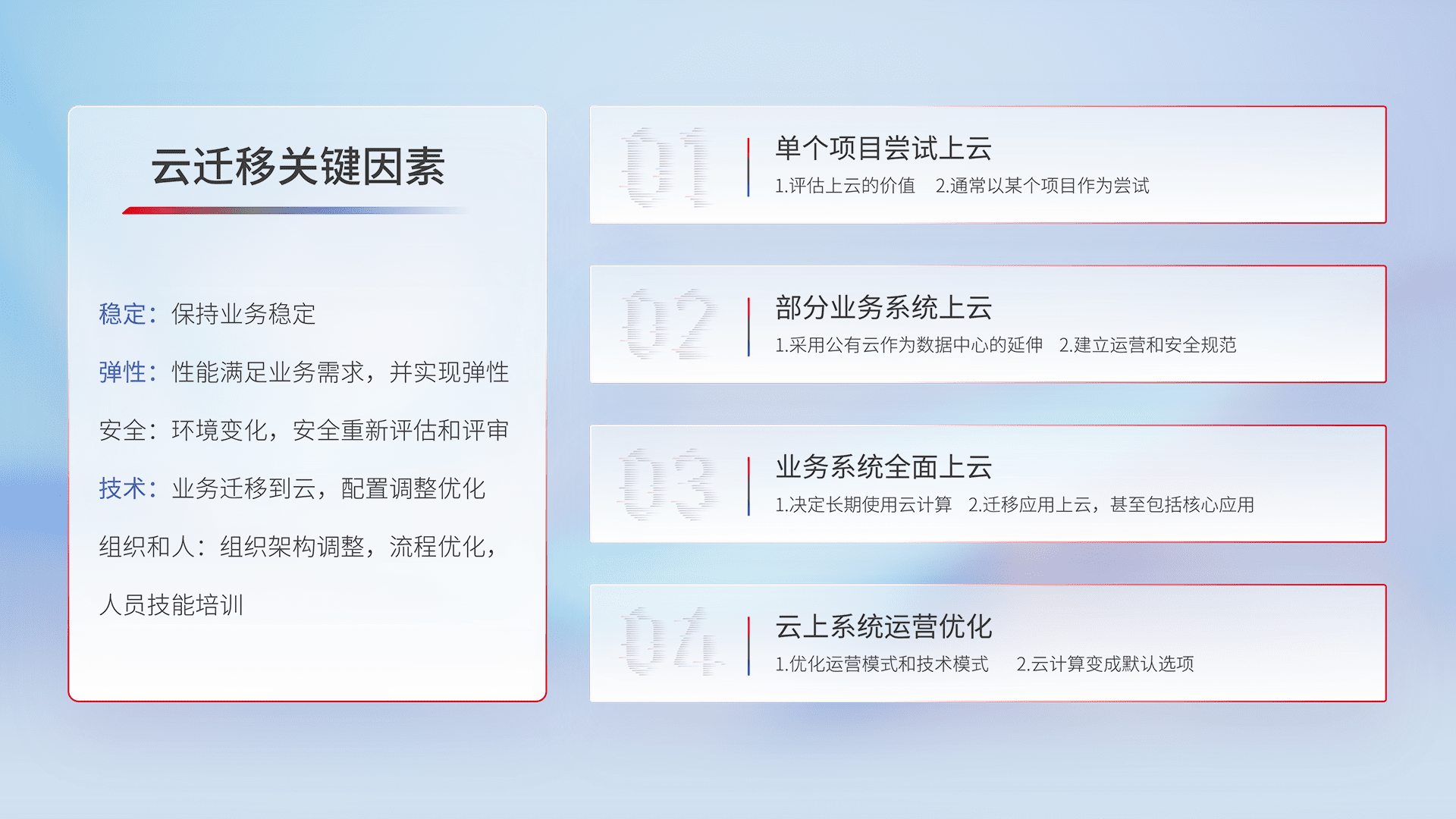 结合实际业务,,,从规划设计、、、、云平台选型、、、、云原生改造、、数据迁移、、集成交付,,,,迁移全过程为客户识别最佳上云路径,,,,做好风险识别管理,,设计网络架构、、、、身份权限、、、安全审计合规、、操作审计、、、、日志审计、、、监控告警策略、、多站点容灾设计等,,,对云上基础设施进行整体规划,,,,提升IT治理水平,,,,以满足弹性、、、、高可用、、、高性能的需求。。。。